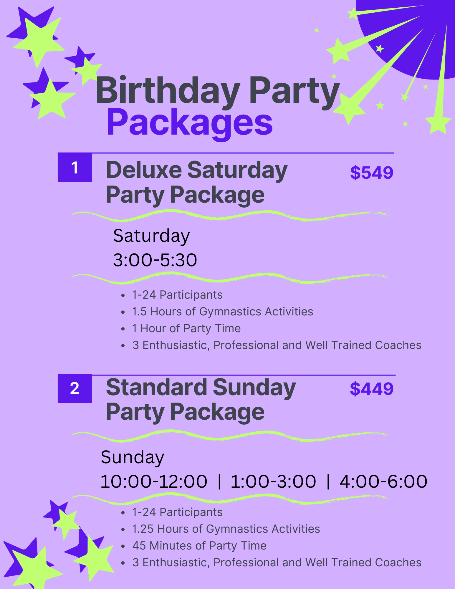 Regardless of Party Package, no one will be allowed back out on the gym floor after the “gym time” portion has ended.